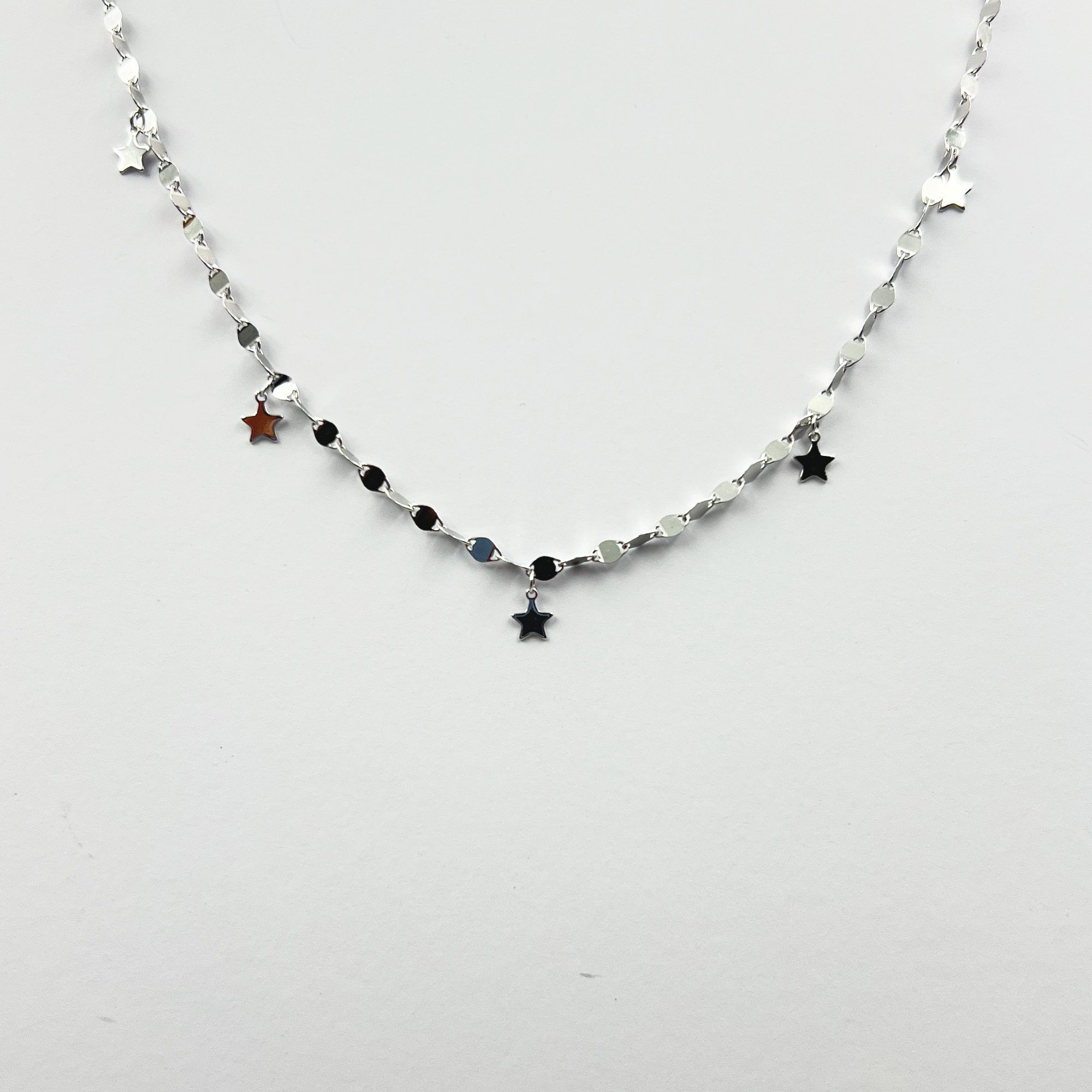 Mini star drops in vibrant colours hang from a sleek silver chain — perfect for everyday charm.