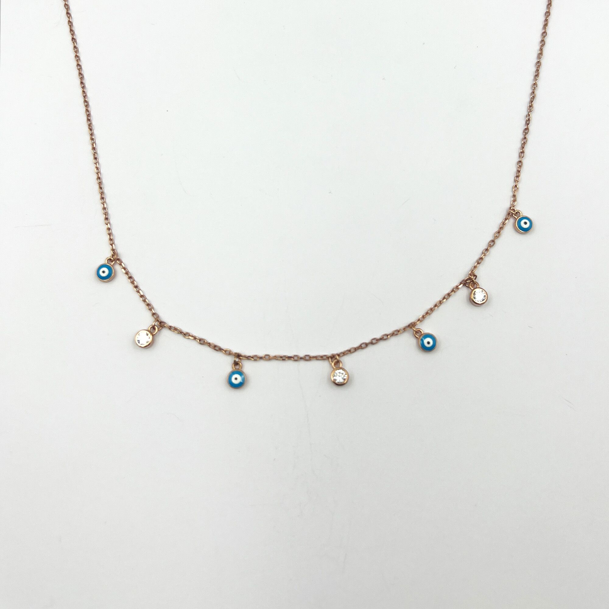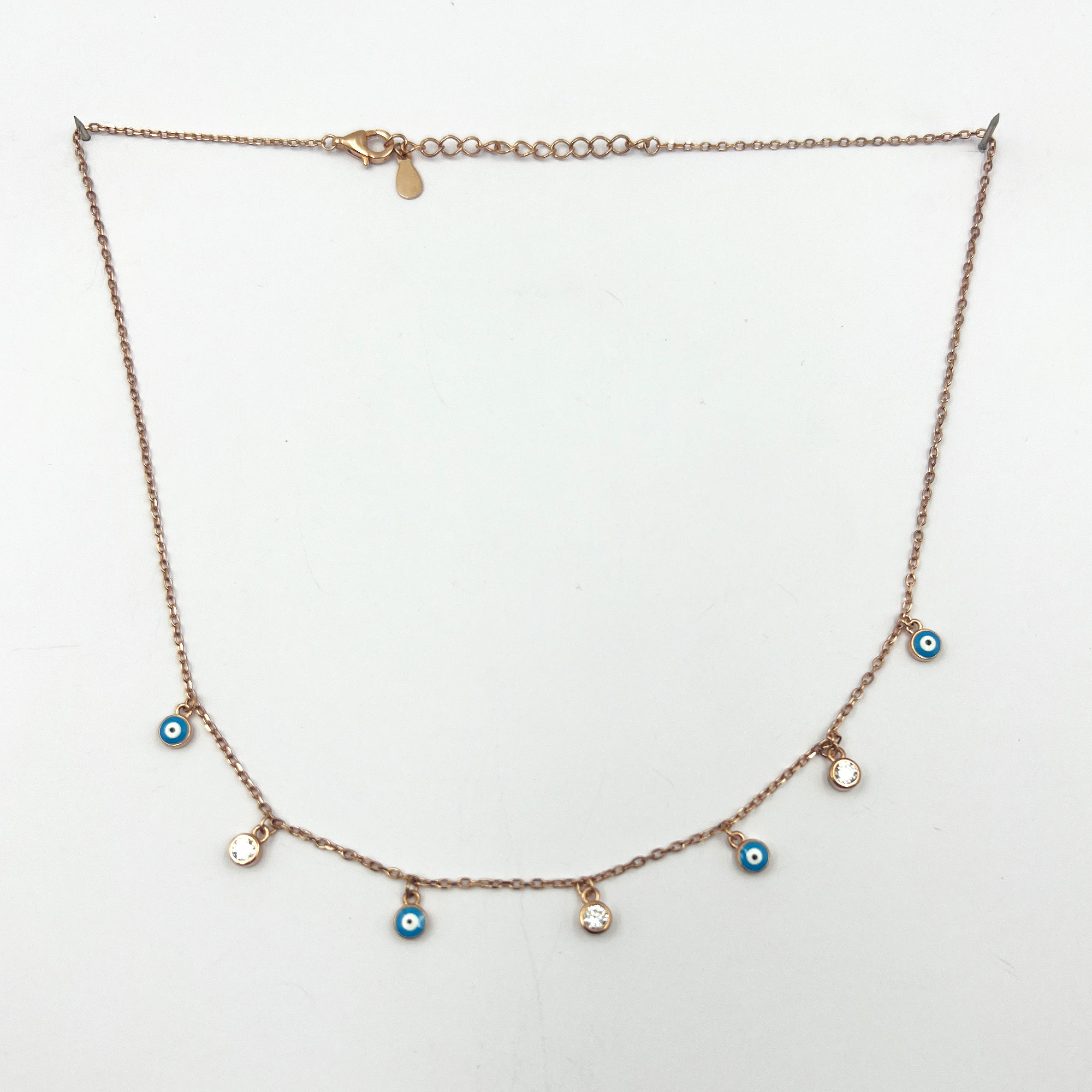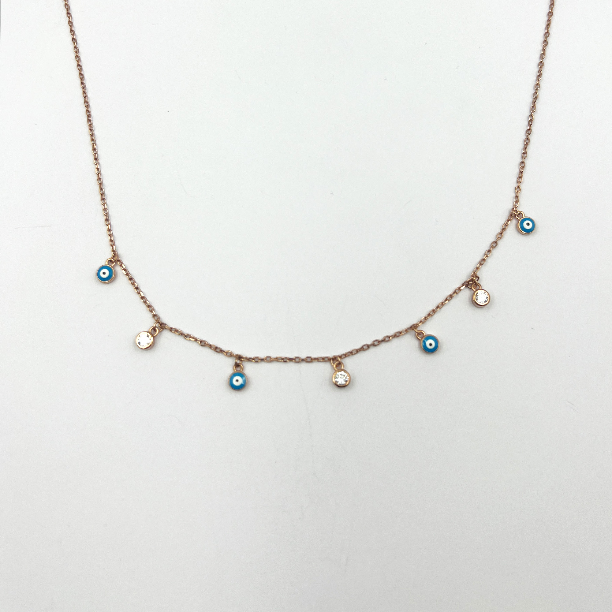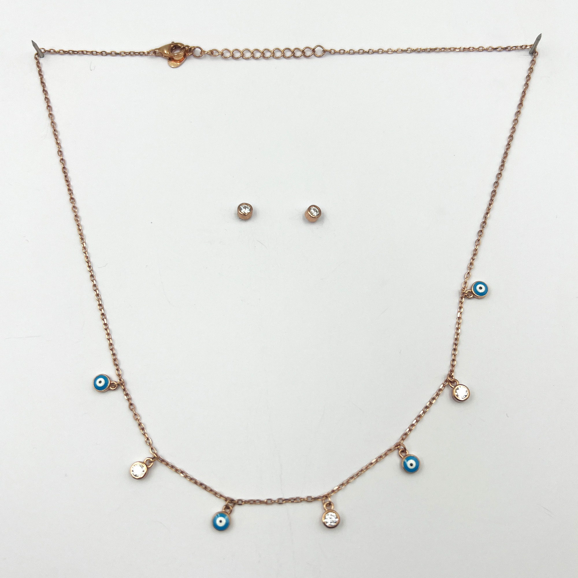 A playful twist of rose gold, shimmer, and protective charm. Dusky Glint balances elegance with symbolism—tiny evil eyes ward off envy while crystals reflect your quiet shine. Wear it when you’re not just dressing up, but powering up.