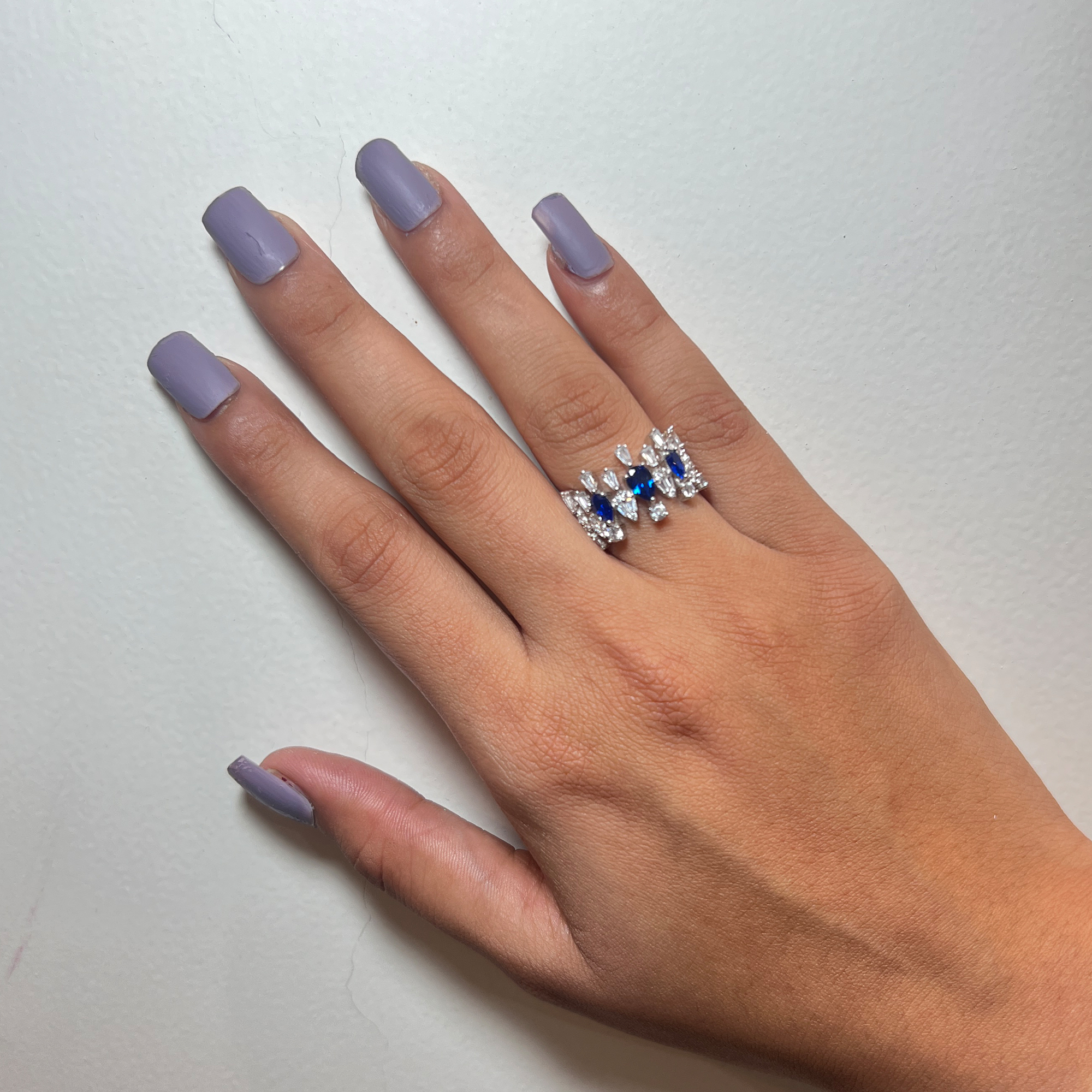 The Elara Ring captures celestial charm — deep blue stones encased in fine 925 silver detailing. Bold yet refined, it’s a statement for those who carry their calm like a crown.