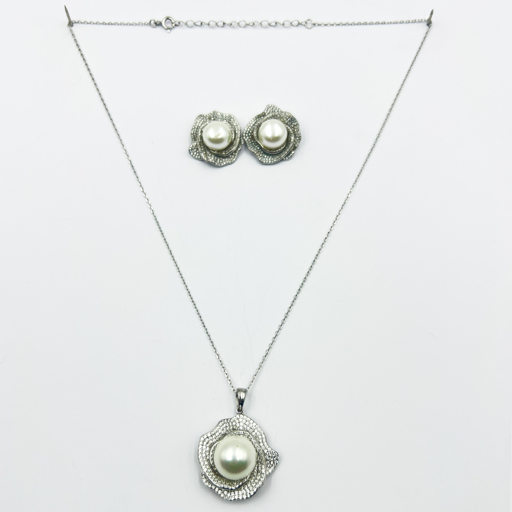 Grace meets glow in Moonbloom — a delicate 925 silver set that frames a luminous pearl within blooming petals of zircon shimmer. Romantic, timeless, and subtly dramatic, this set is made for the moonlit muse who carries softness with strength.