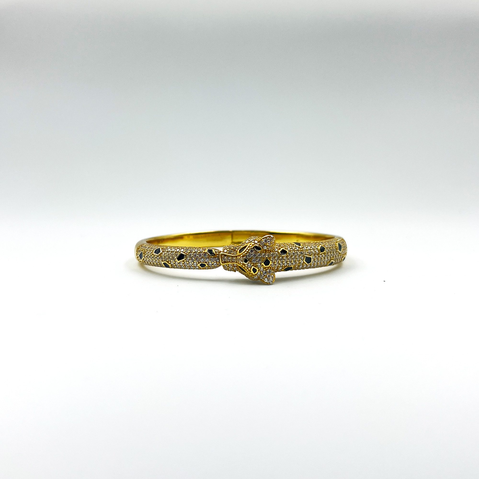 Unleash your bold side with the Panthera Luxe Cuff — a fierce fusion of elegance and strength. Crafted in 925 sterling silver and finished with a radiant gold polish, this panther-head bangle dazzles with intricate black enamel spots and micro pavé detailing. A striking statement piece that channels raw power and luxury in perfect harmony.