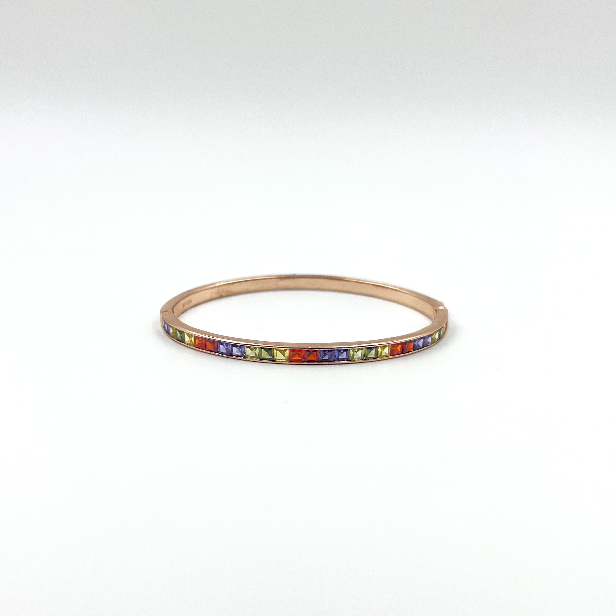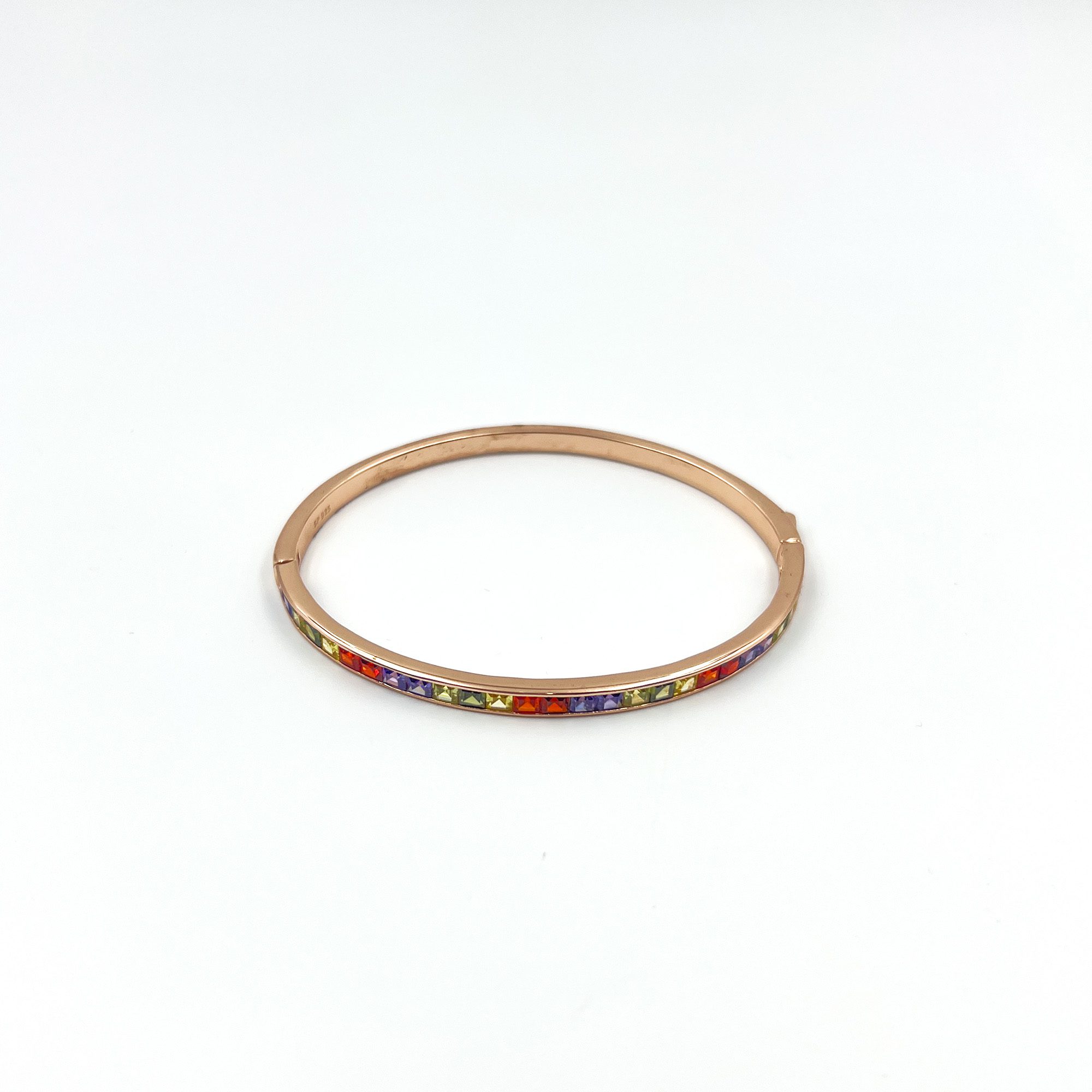 Say hello to color in its chicest form. The Prism Glow Bangle, crafted in 925 sterling silver with a rose gold finish, features a seamless line of princess-cut stones in a joyful gradient of rainbow hues. Sleek, stackable, and mood-lifting — it’s your everyday reminder to shine in every shade.