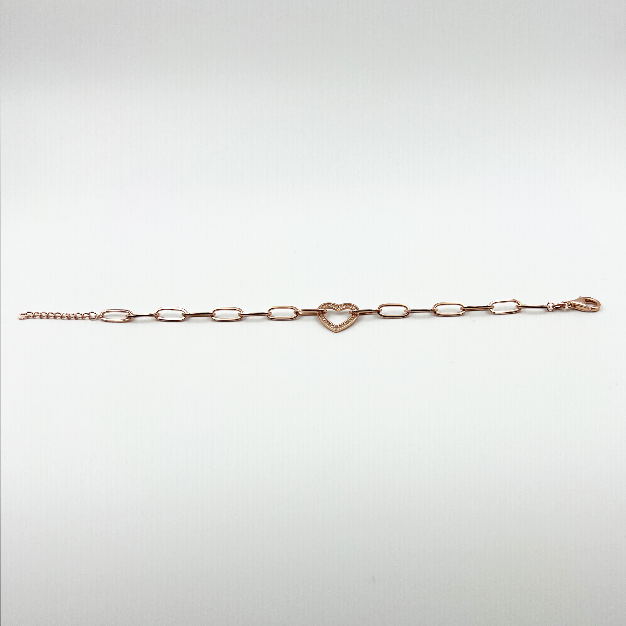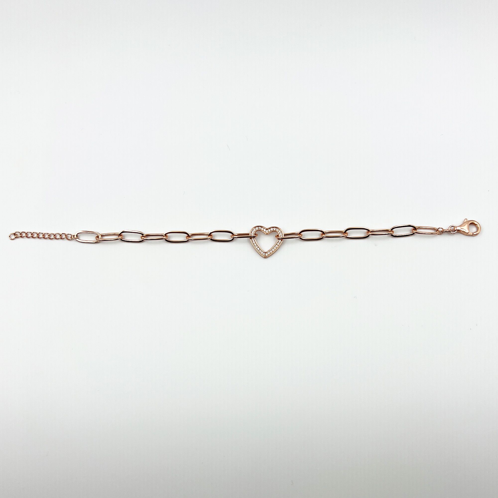 Sculpted in 925 sterling silver with a soft rose‑gold finish, this open‑heart centerpiece sits gracefully on bold elongated links — a chic token of love with a contemporary edge.